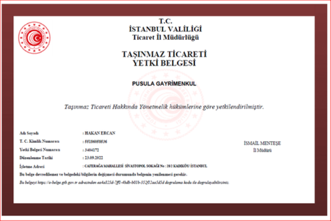 Hakan ERCAN Pusula Gayrimenkul Taşınmaz Ticareti Yetki Belgesi
